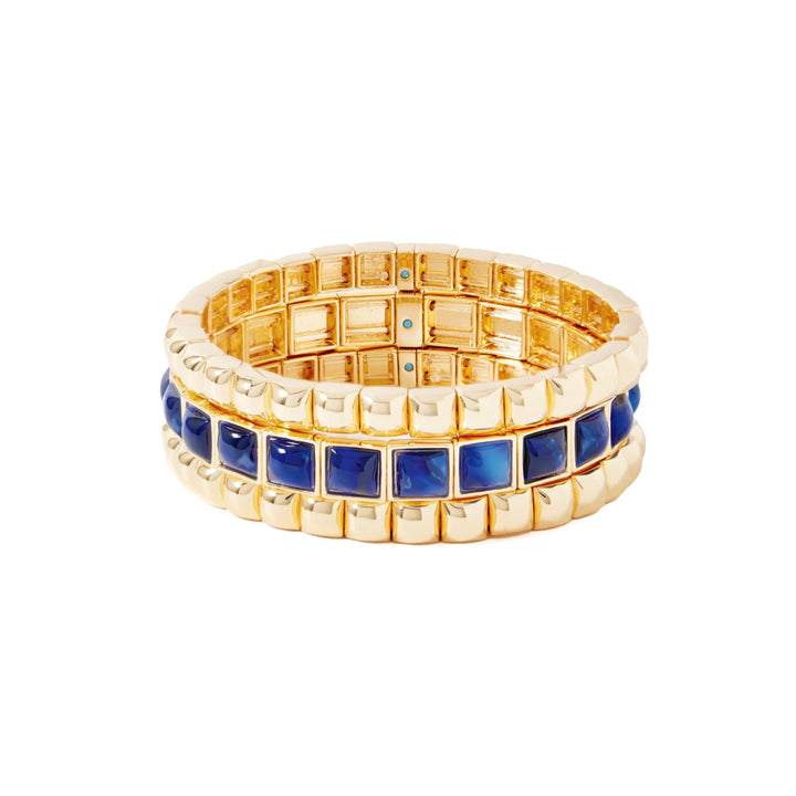 This is a wide, gold-toned stretch bracelet designed with two rows of square-cut sapphire-blue stones.