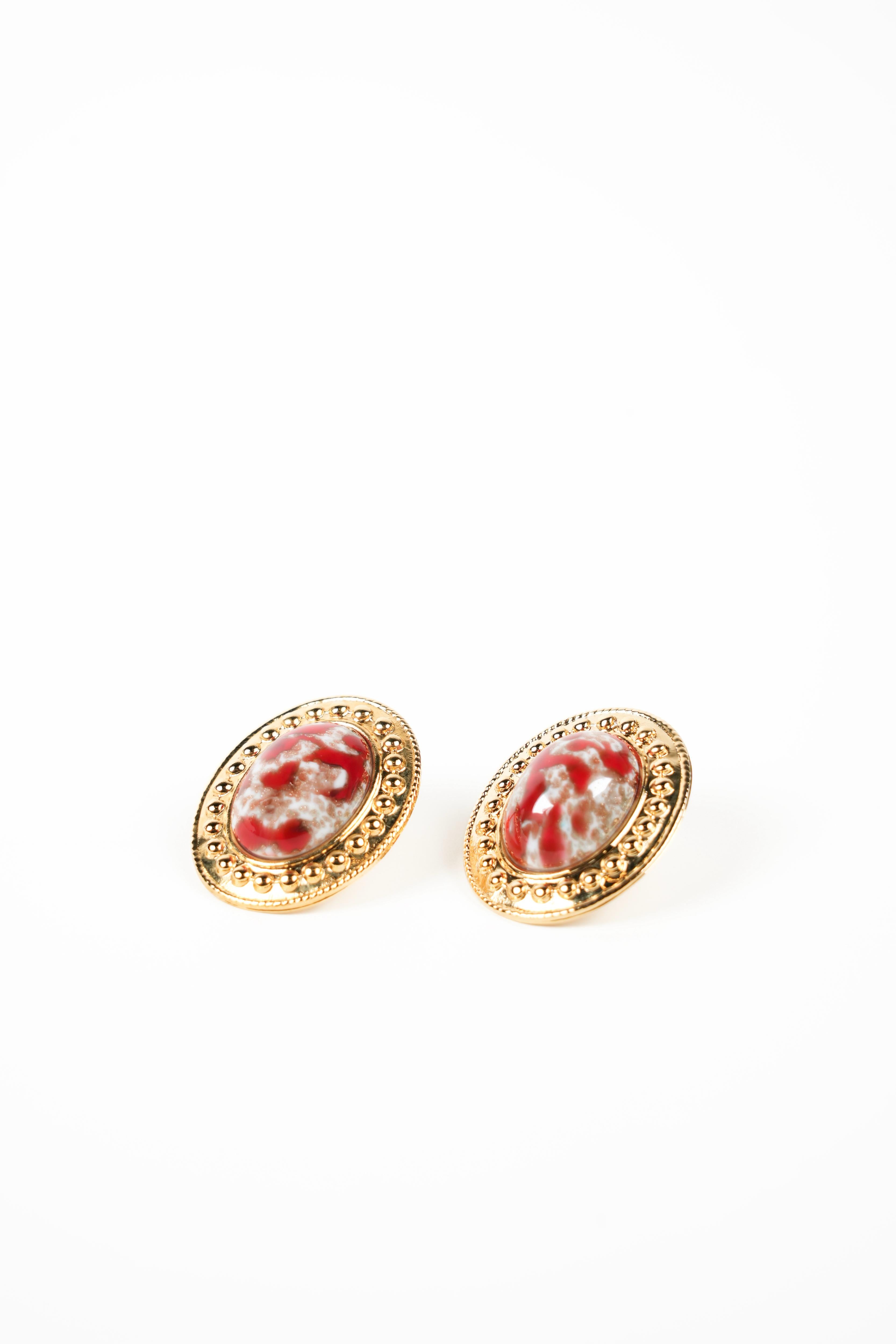 Ignite your look with our Red Flame Studs. These striking earrings feature a vibrant red stone with unique white marbling, set in a classic gold frame. They're perfect for adding a bold and fiery touch to your style.